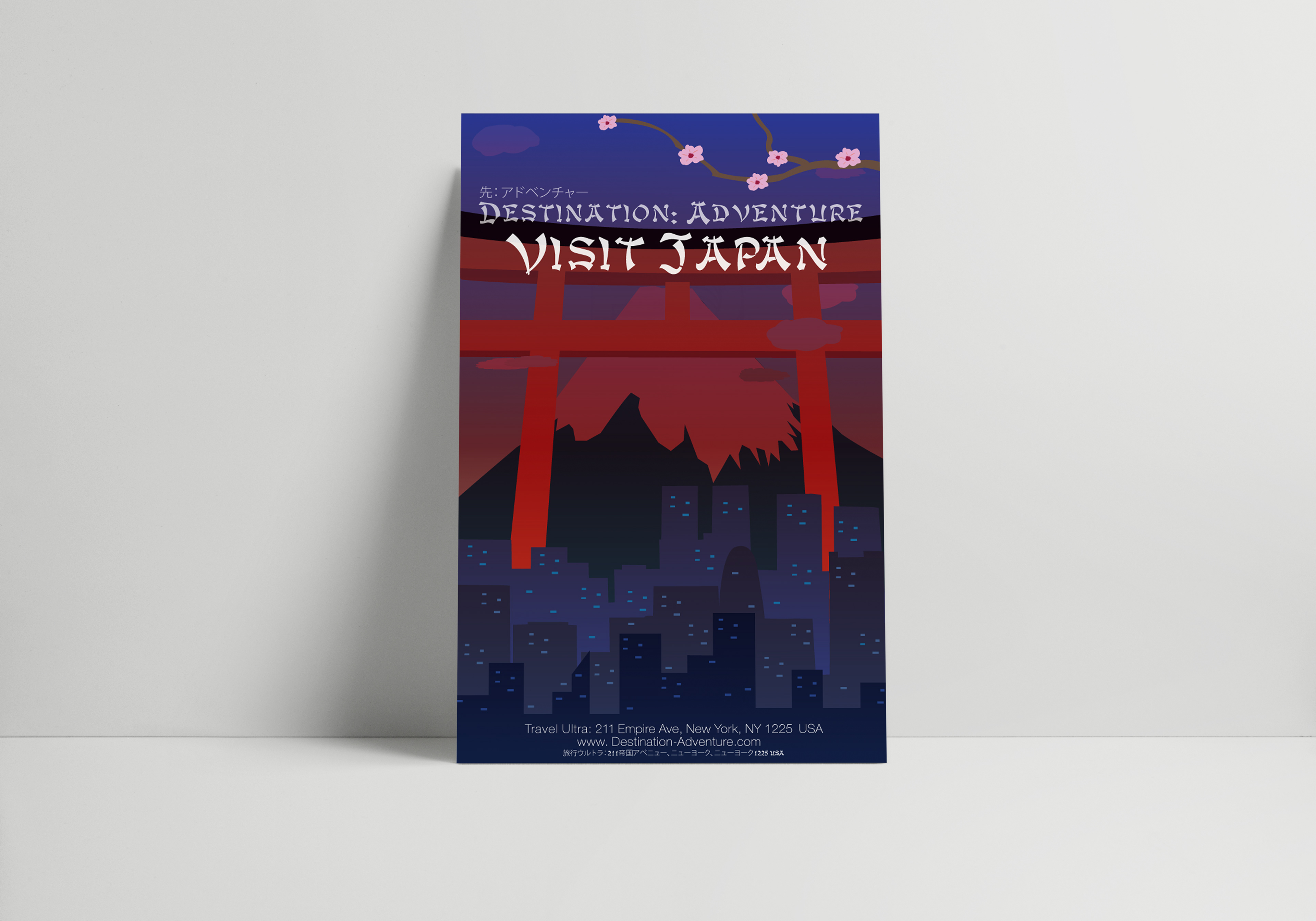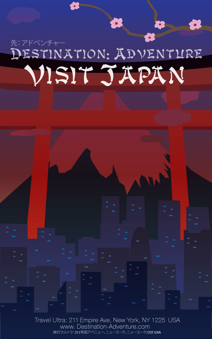 The fictitious Destination: Adventure is the leading company travel and vacation companies ever. Their latest package would take you to the land of the rising sun, Japan. Their poster features many of the beautiful aspects that you would see in Japan. Such as Tokyo's beautiful skyline, Mt. Fuji, Torii Gates and sakura blossoms.